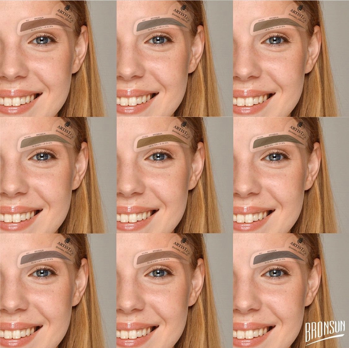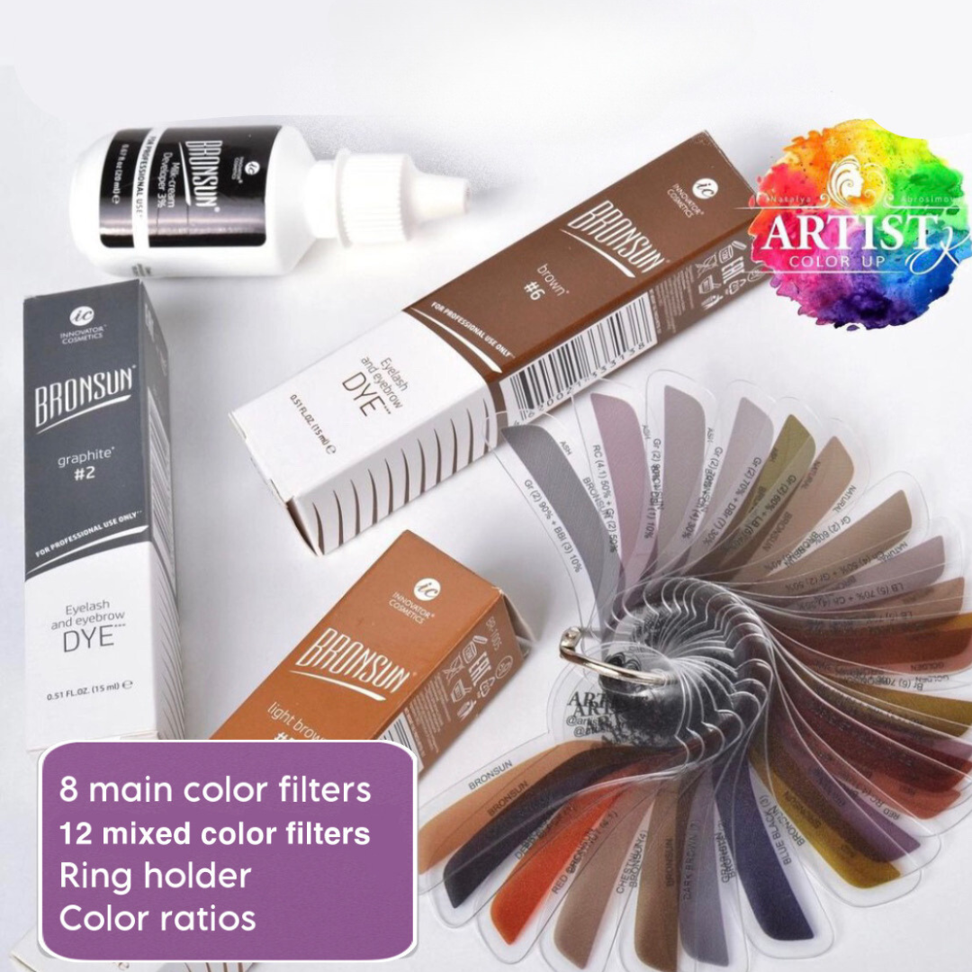 his book includes plastic eyebrow filters that can be used to hold onto your clients brows to see which color suits best.